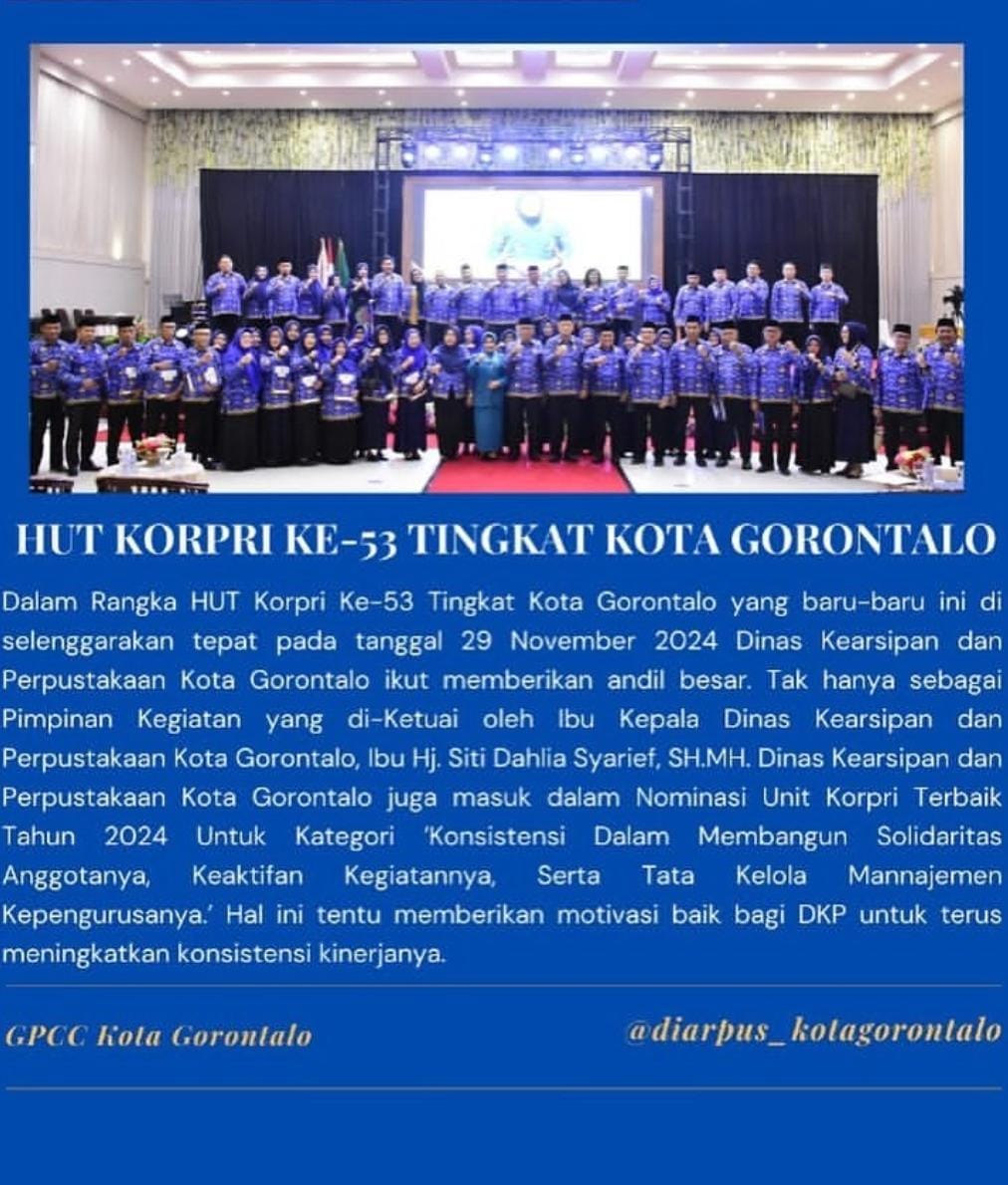 Dinas Kearsipan dan Perpustakaan Kota Gorontalo Mendapatkan Penghargaan dalam Nominasi Unit Terbaik Satu Kategori 'Konsistensi Dalam Membangun Soludaritas Anggotanya, Keaktifan Kegiatannya, Serta Tata Kelola Manajemen Kepengurusannya."